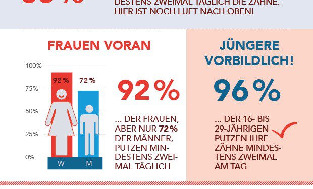 Aktuell putzen 92 Prozent der Frauen mindestens zweimal täglich ihre Zähne. Im Vergleich dazu lediglich 72 Prozent der Männer. Somit sind Frauen, wie bereits vor vier Jahren, weiterhin gewissenhafter bei der Putzhäufigkeit. Passend dazu beurteilen Frauen die Wichtigkeit der Mundgesundheit etwas höher als Männer3.